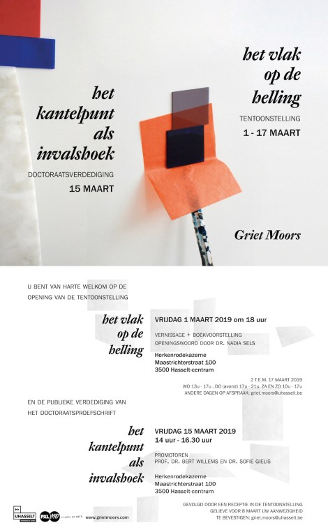 Met de tentoonstelling ‘Het vlak op de helling’ opent Griet Moors, kunstenares en onderzoekster aan School of Arts PXL-MAD en Universiteit Hasselt, op 1 maart 2019 het beeldend luik van ‘Het kantelpunt als invalshoek’, haar doctoraal onderzoek in de kunsten.