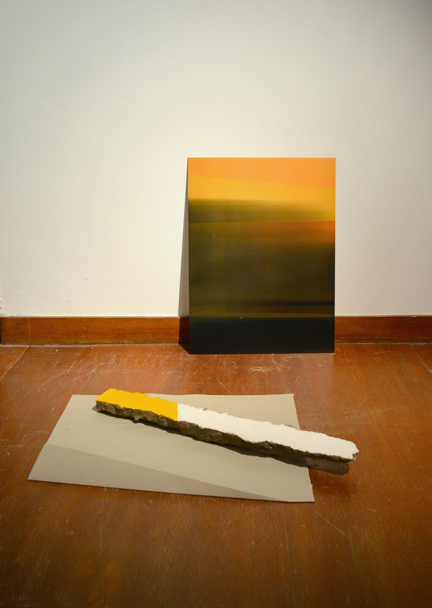 Published 25/04/2016 at 1417 × 1991 in PROJECTS ← Previous Next → Y/Y/P/E/P – print on dibond, plaster, earth, spray paint and paper – 70 cm x 40 cm x 90 cm – 2016 (with Frame intervention)